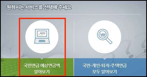 6. "원하시는 서비스를 선택해 주세요"라는 팝업 창이 뜨면 왼쪽 국민연금 예상연금액 알아보기를 클릭해 주세요.