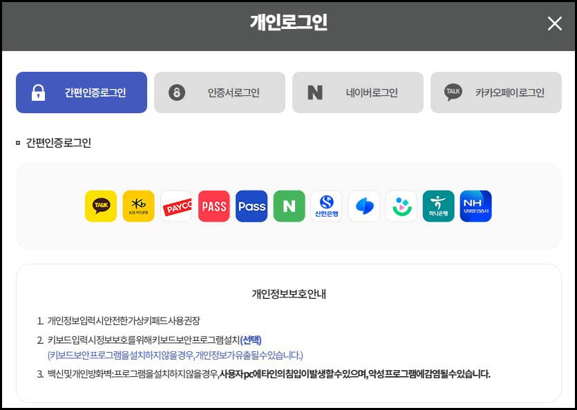4. 개인로그인 화면에서 간편 인증로그인, 인증서로그인, 네이버로그인, 카카오페이로그인 중 본인에게 가장 편한 방법으로 로그인하시면 됩니다.