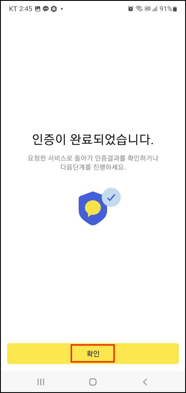 8. 인증 완료 페이지가 나오면 확인을 눌러주세요.