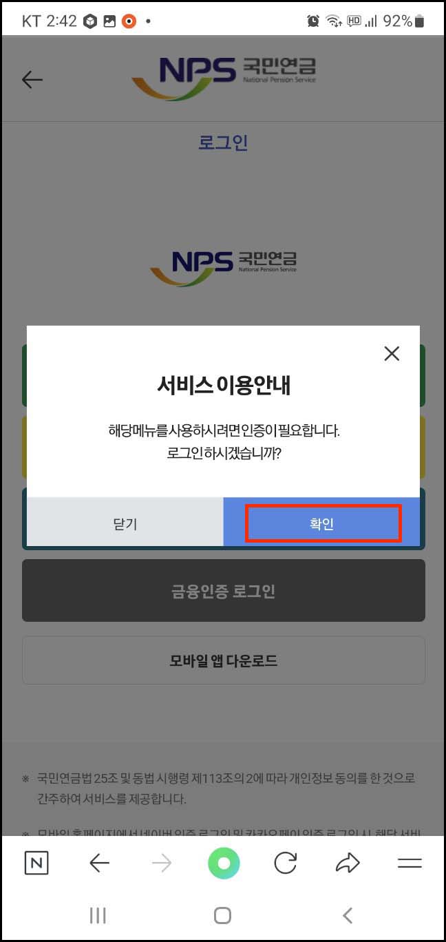 4. 서비스 이용 안내 팝업 창이 뜨며 인증이 필요해 로그인하라는 메시지가 나옵니다. 확인을 눌러주세요.
