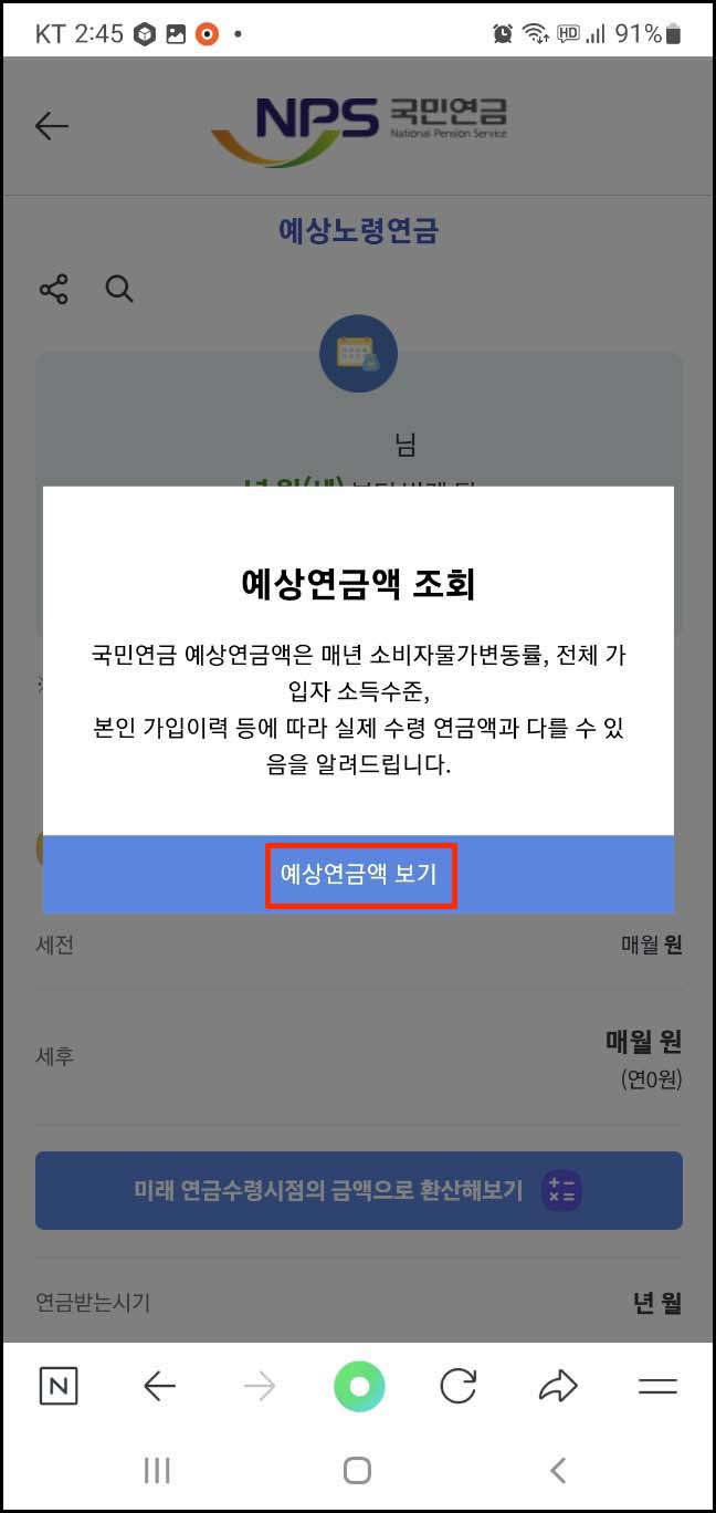 9. 예상 연금액 조회 팝업 창이 나오면 예상 연금액 보기를 눌러줍니다.