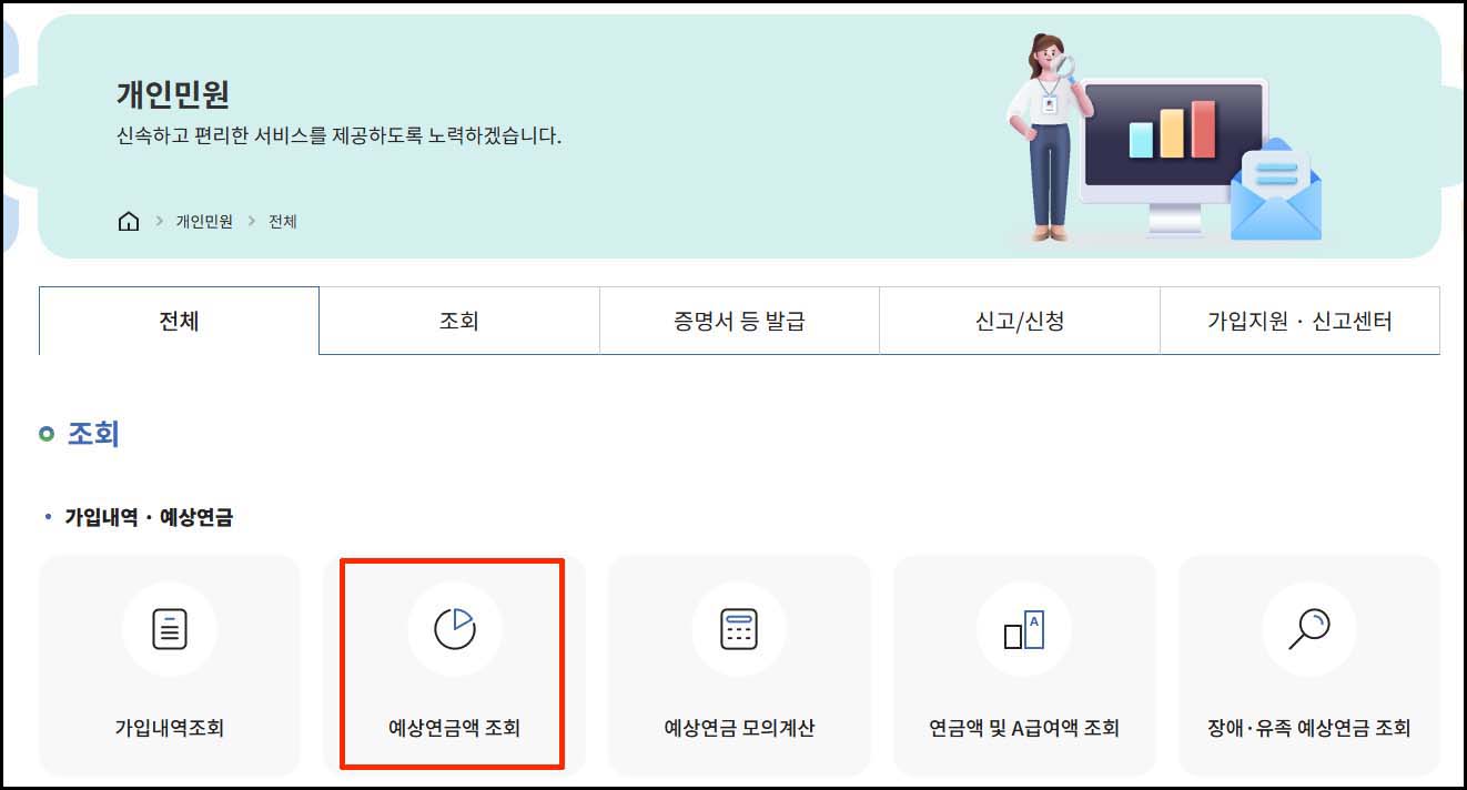 5. 개인 민원 페이지에서 예상 연금액 조회를 눌러주세요.