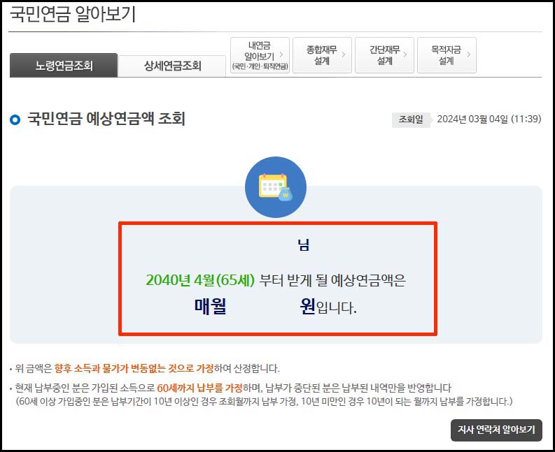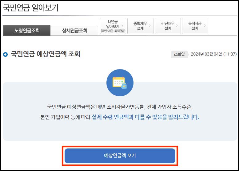 10. 국민연금 예상 연금액을 조회하고 있습니다.