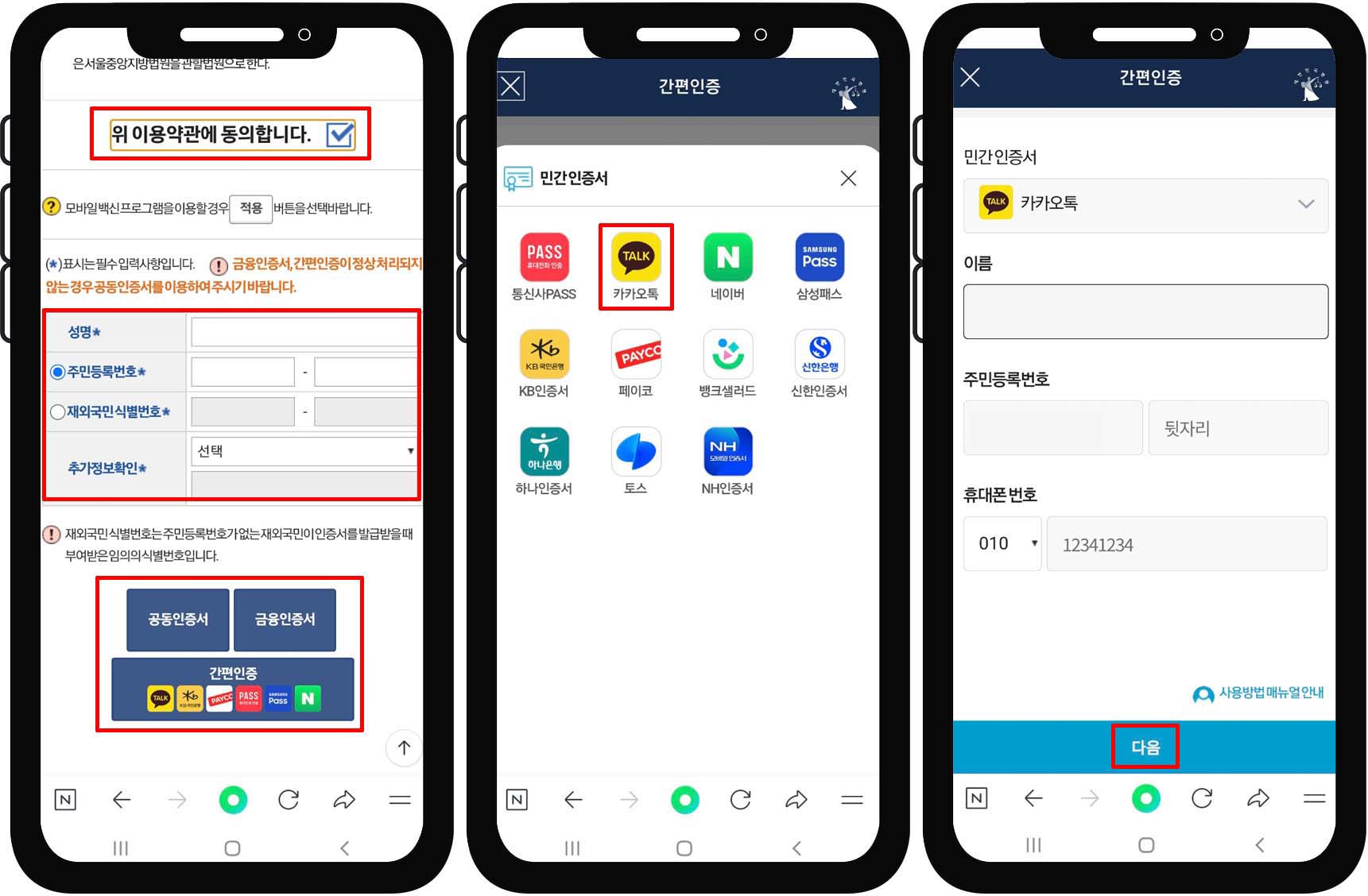 7. 이름, 주민등록번호, 휴대폰 번호 입력 후 "다음" 클릭