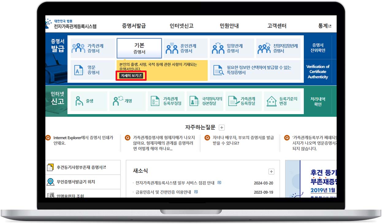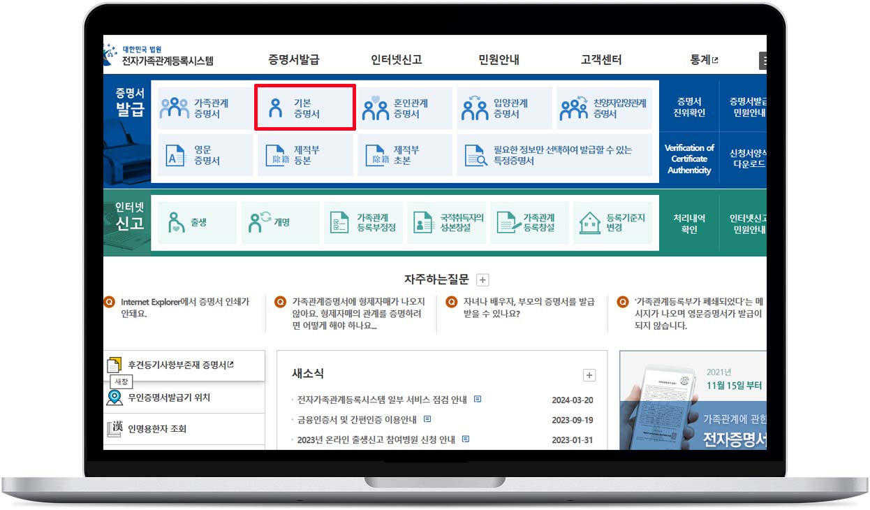 기본증명서 인터넷 발급(무료) - 대법원 전자가족관계 등록시스템 홈페이지