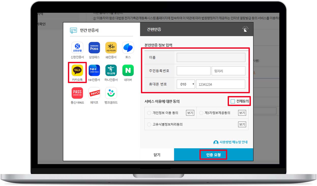 6. 카카오톡 선택(본인이 편한 인증 선택), 본인인증 정보 입력, 전체동의 체크 후 "인증 요청" 버튼 클릭