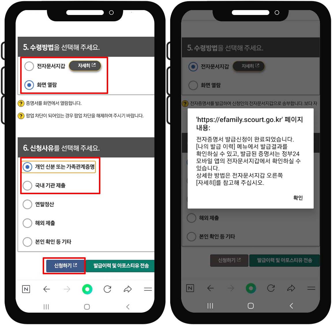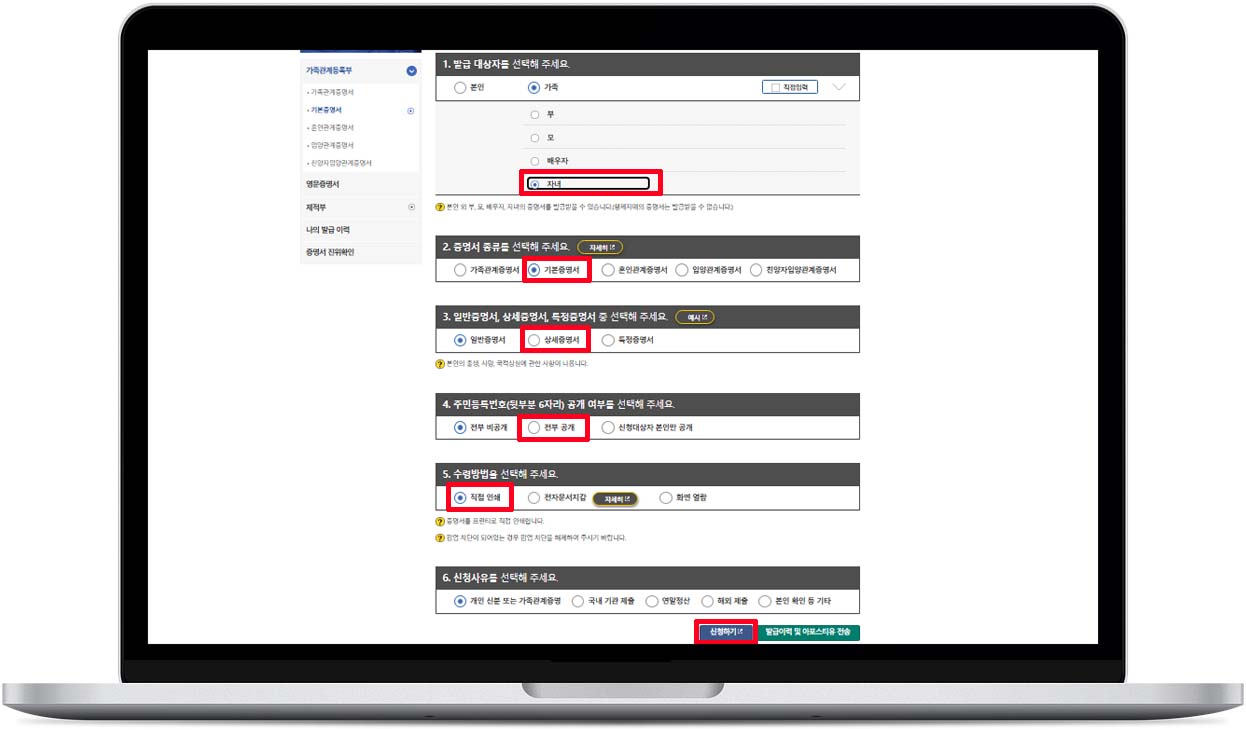 • 신청 사유 : 개인 신분 또는 가족관계 증명 선택