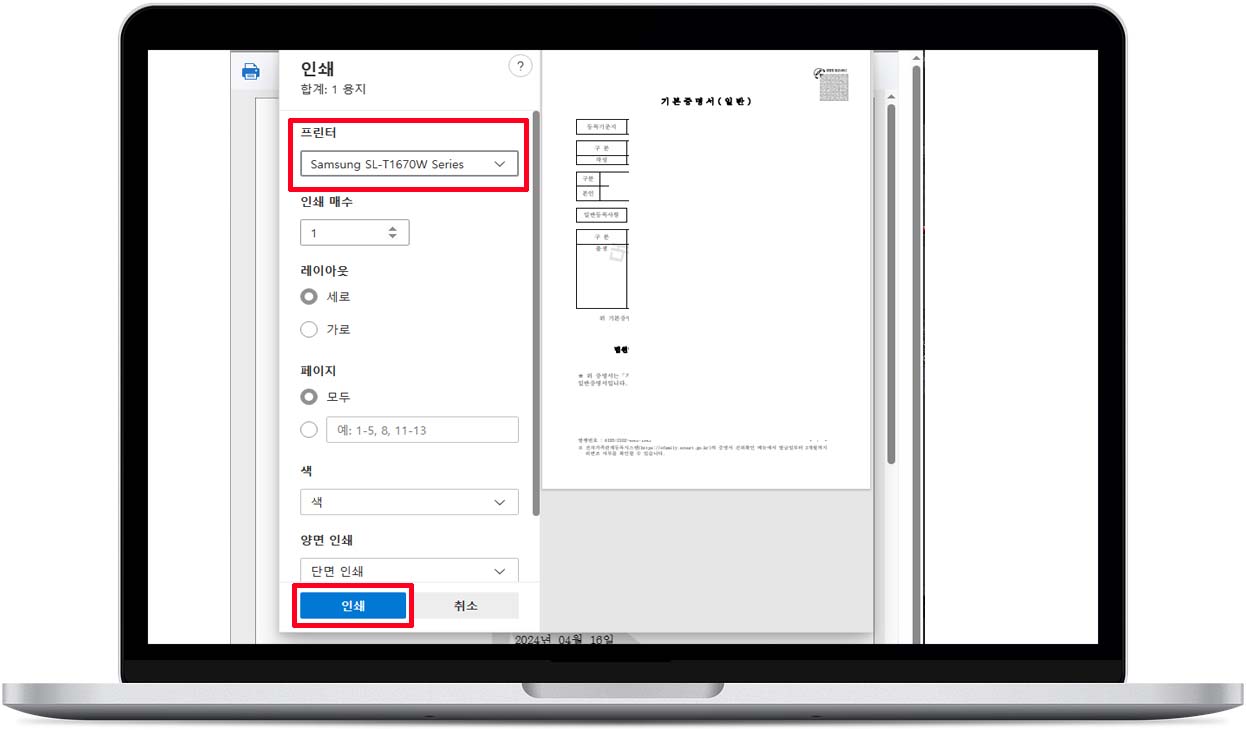 10. 인쇄할 경우 사용 가능한 프린터 선택 후 "인쇄" 버튼 클릭