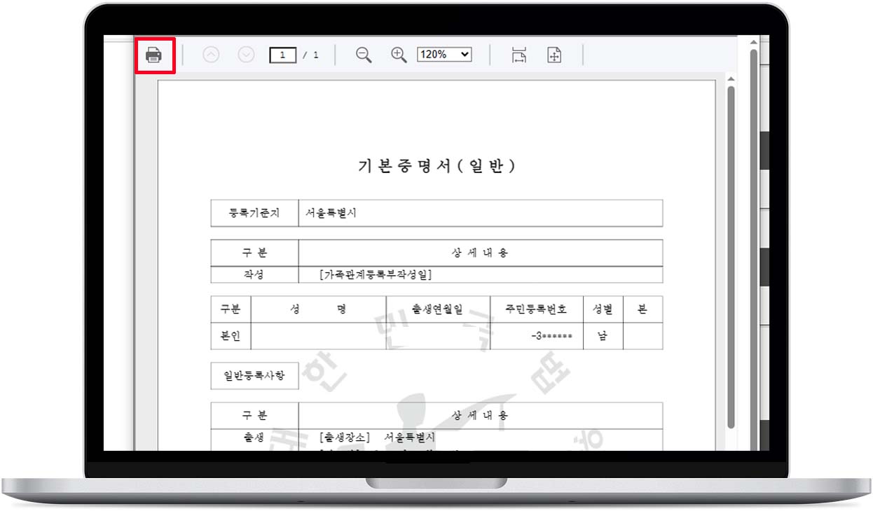 9. 기본증명서 미리 보기 화면 왼쪽 상단에 프린터 모양 아이콘 선택