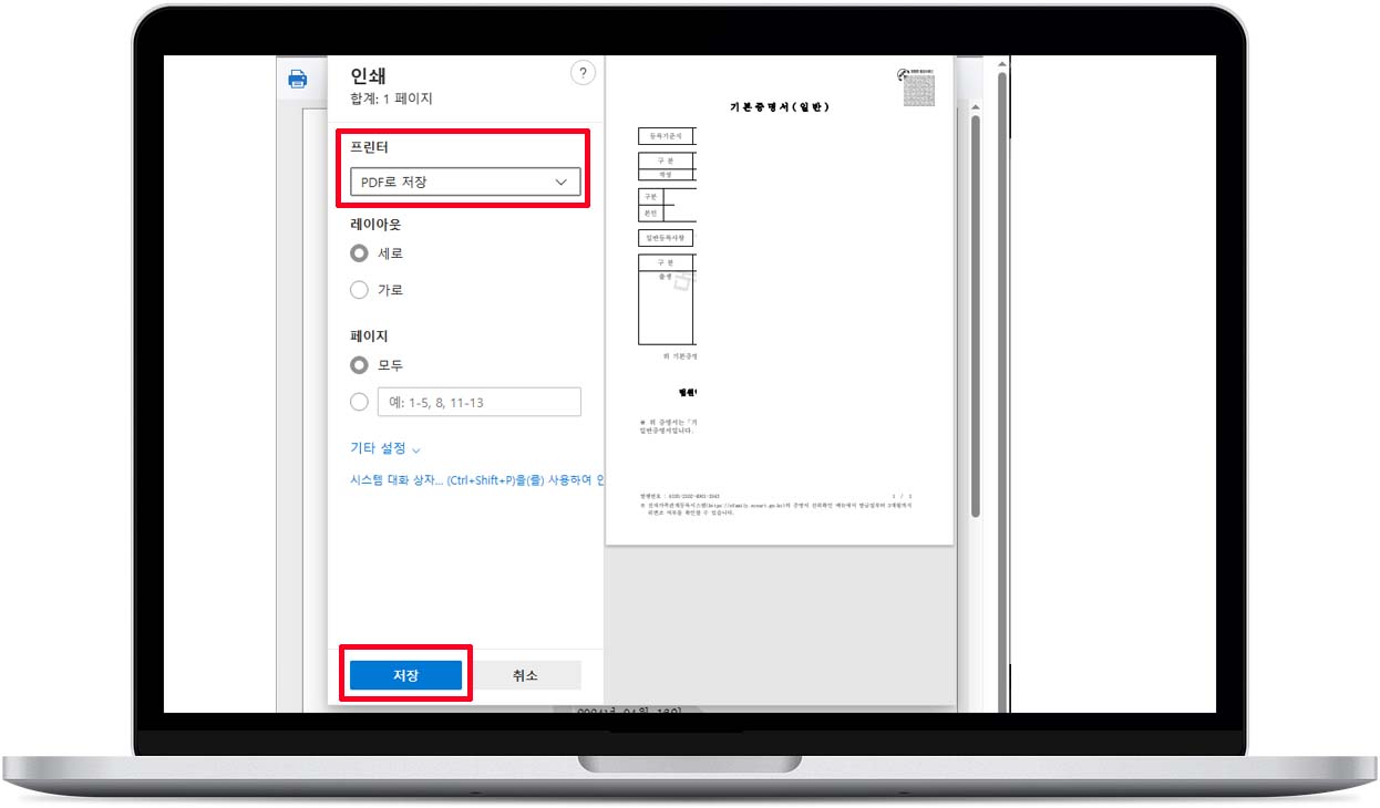 11. PDF 파일로 저장할 경우 프린터 항목에서 "PDF로 저장" 선택 후 "저장" 버튼 클릭
