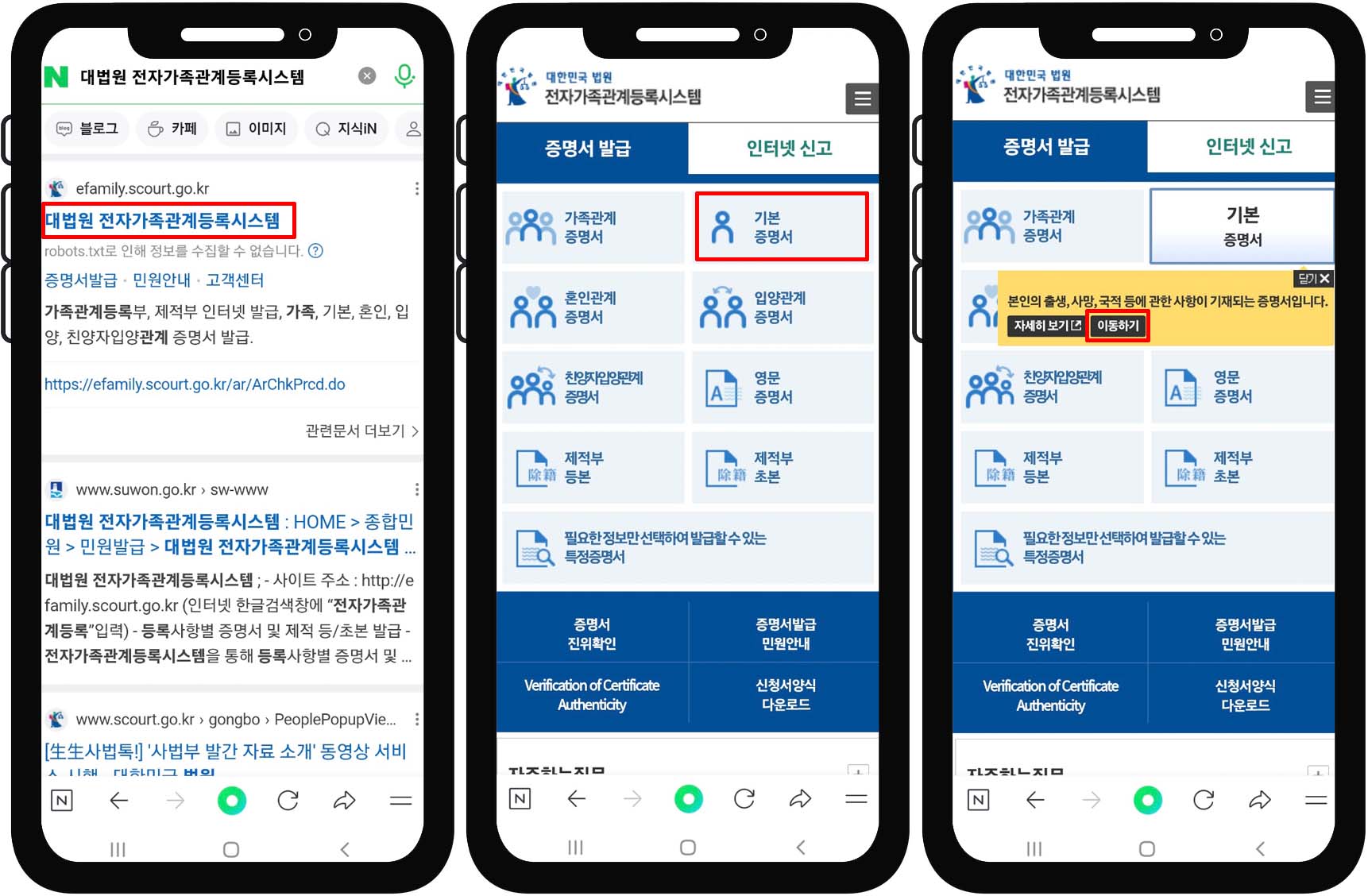 기본증명서 모바일 발급(무료) - 대법원 전자가족관계 등록시스템 모바일 홈페이지