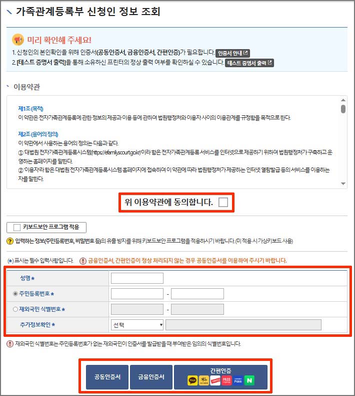 5. 가족관계등록부 신청인 정보 조회 화면에서 이용약관 동의에 체크하시고, 성명, 주민등록번호, 추가 정보 확인(부 성명, 모 성명, 배우자 성명, 자녀 성명, 등록기준지 중 1개 선택)을 입력한 후 신청인 본인 확인을 위해 공인인증서, 금융인증서, 간편 인증 중 본인이 가장 편한 방법으로 인증을 진행하면 됩니다.