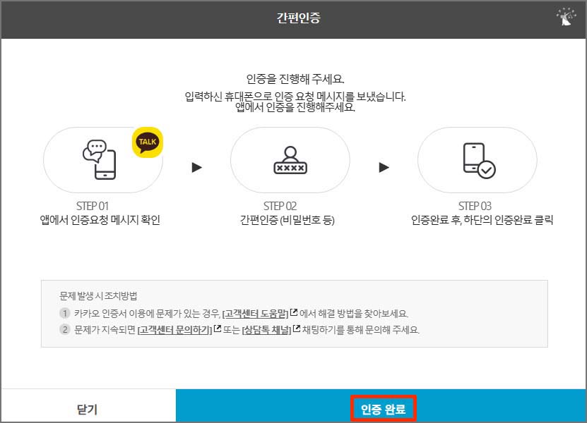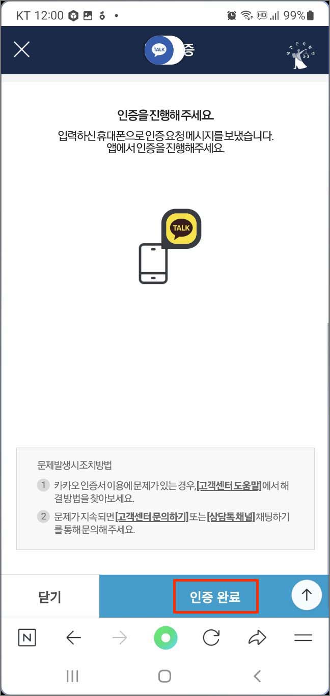 9. 카카오톡에서 인증을 완료한 후 간편 인증 페이지에서 인증 완료 버튼을 클릭합니다.