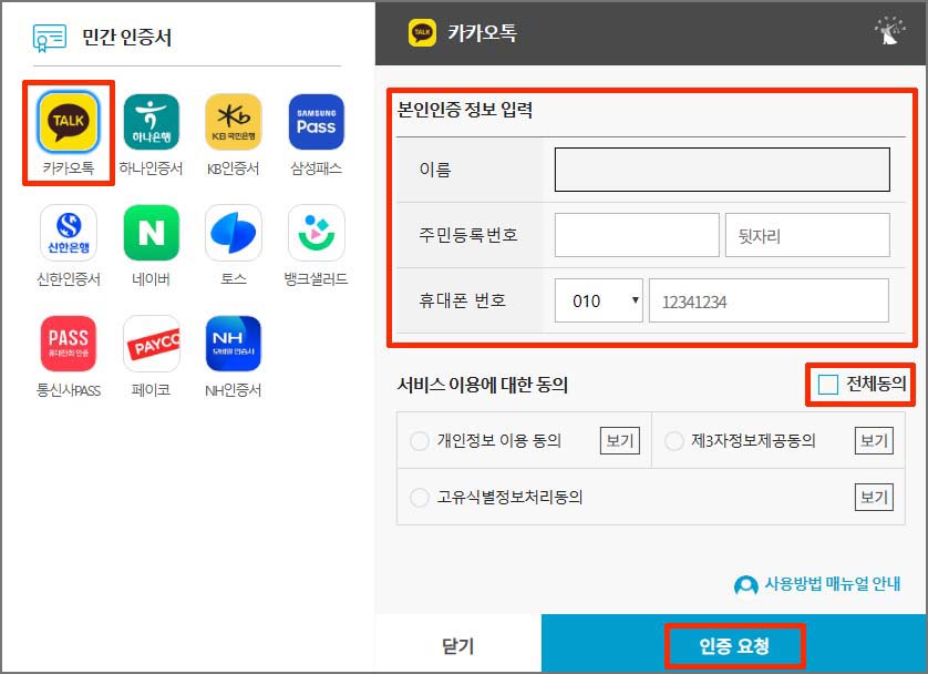 5. 민간 인증서 중 카카오톡(다른 인증 방법을 선택하셔도 됩니다.)을 선택하고, 본인인증 정보 입력란에 이름, 주민등록번호, 휴대폰 번호 입력 후 전체동의에 체크하고 인증요청 버튼을 클릭합니다.