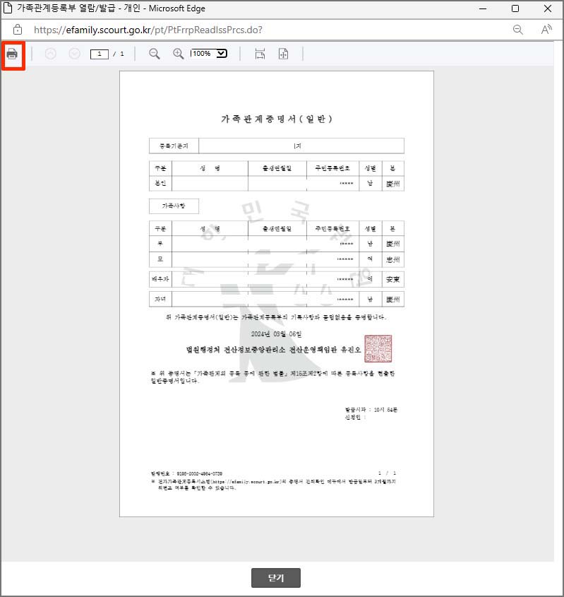 8. 가족관계증명서 미리 보기 창이 나오면 왼쪽 상단에 프린터 모양의 아이콘을 선택해 주세요.
