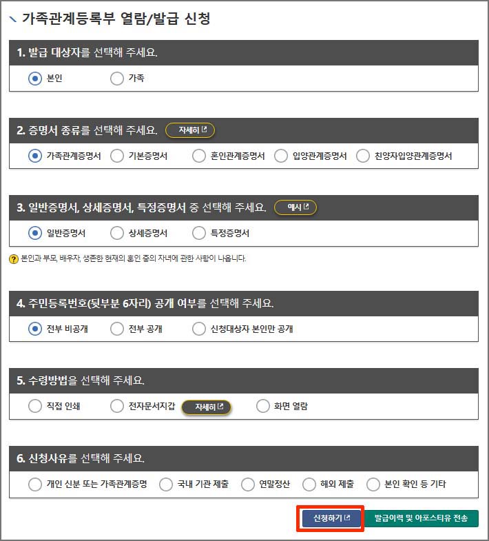 10. 가족관계등록부 열람/발급 신청 화면 나오면 세부 선택 항목이 나오게 되는데 필요한 부분에 선택하고 맨 밑에 신청하기 버튼을 눌러주시면 됩니다.