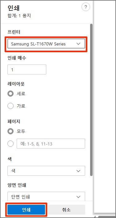 9. 문서 출력을 원하시면 프리터 항목에서 사용할 수 있는 프린터를 선택하고 인쇄 버튼을 눌러줍니다.