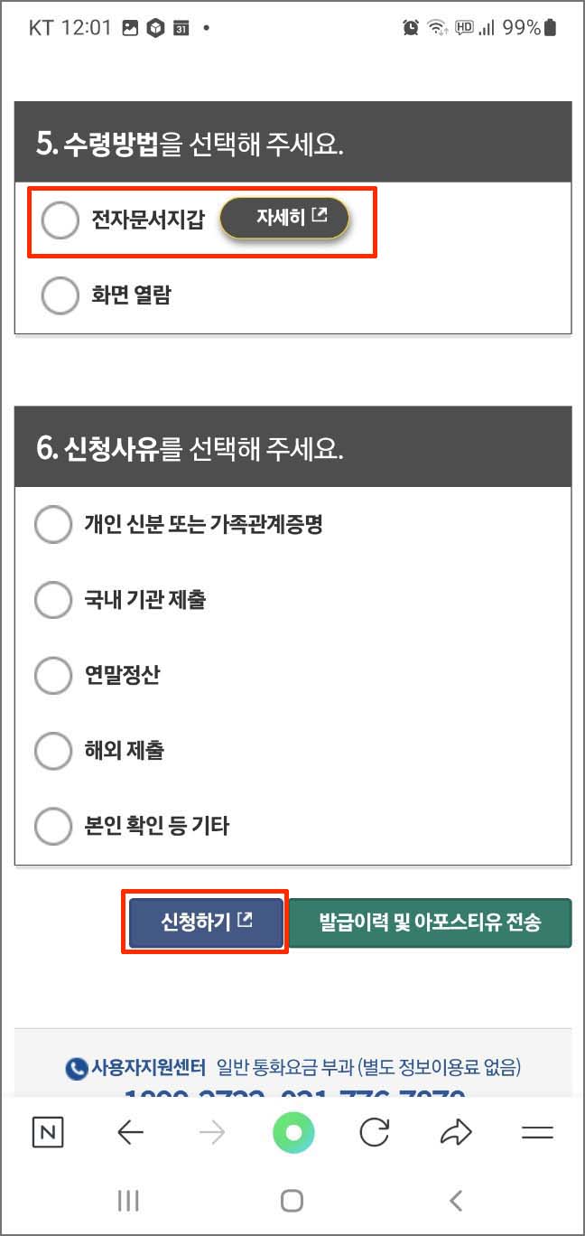 (8) 신청 정보 입력 후 발급 버튼 클릭