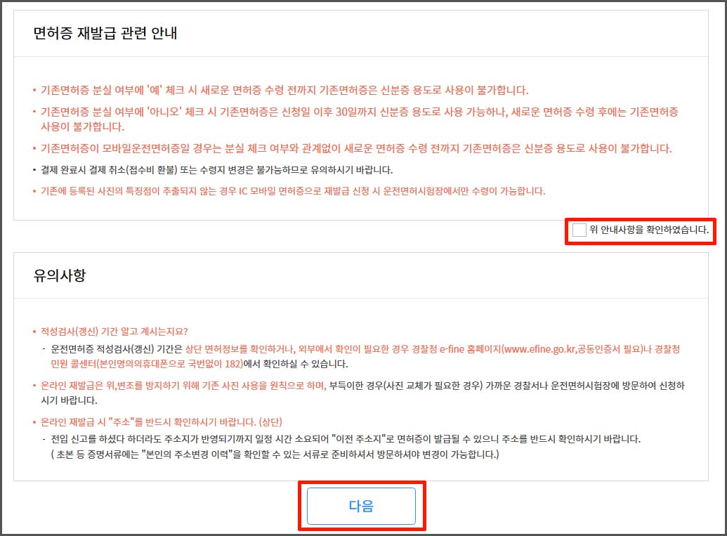 10. 면허증 재발급 화면에서 면허정보 확인, 기존면허증 분실 여부를 반드시 확인하고 체크합니다. 아래로 내려 면허증 재발급 관련 안내 사항 확인 후 체크하고 다음 버튼을 클릭합니다.
