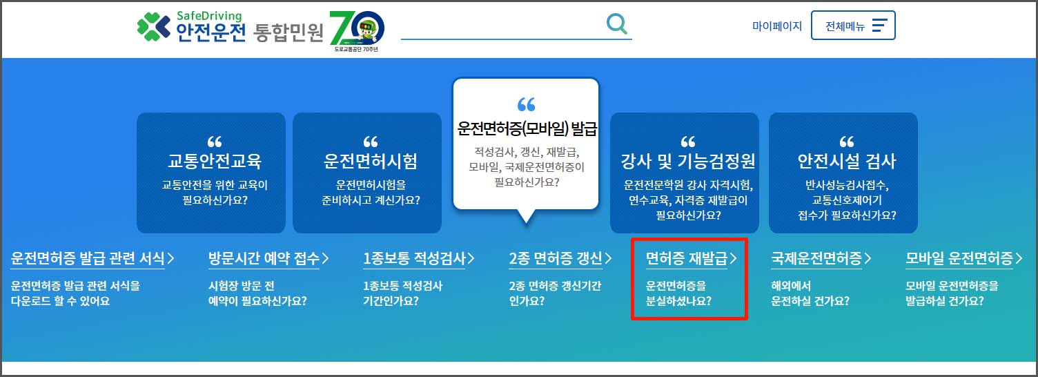 운전면허증 분실신고 및 재발급 인터넷 - 도로교통공단 안전운전 통합민원 홈페이지
