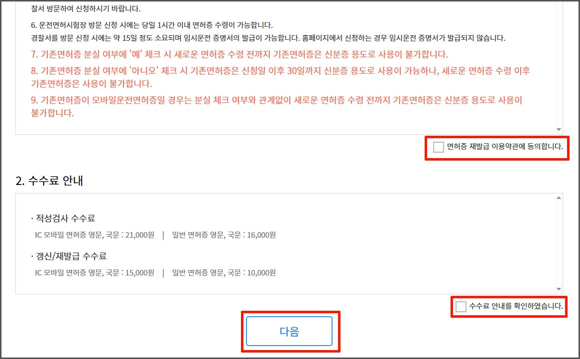 9. 면허증 재발급 이용약관과 수수료 안내 확인을 체크한 후 다음 버튼을 클릭합니다.