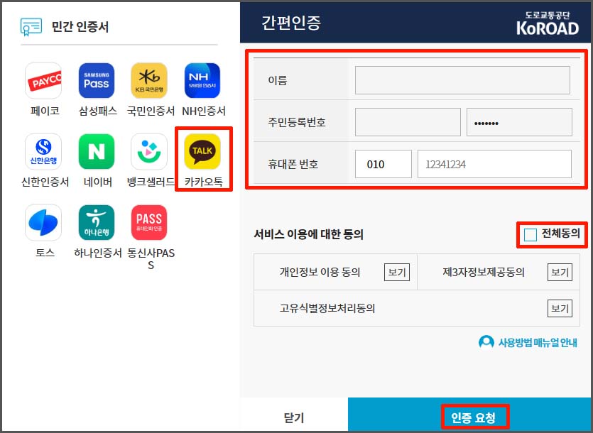 이름, 주민등록번호, 휴대폰 번호를 입력 후 전체동의에 체크, 인증 요청 버튼을 클릭합니다.