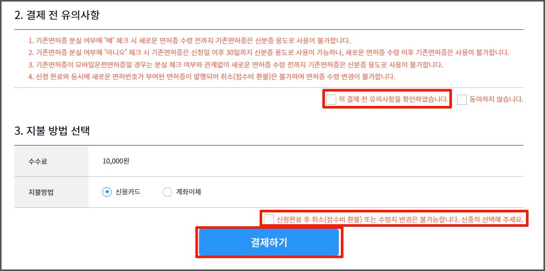 13. 신청 내역을 확인하고 결제 전 유의 사항 확인 후 체크, 지불 방법 선택 및 신청 완료 후 취소(접수비 환불) 또는 수령지 변경 불가 안내에 체크하고 결제하기 버튼을 클릭합니다.