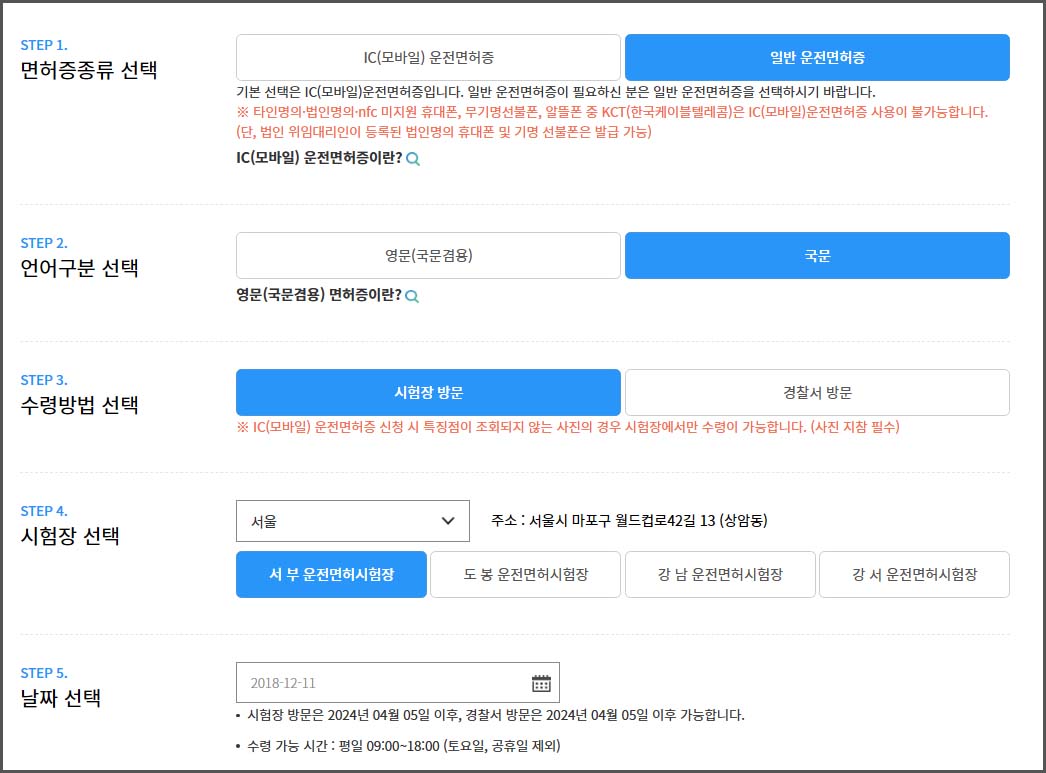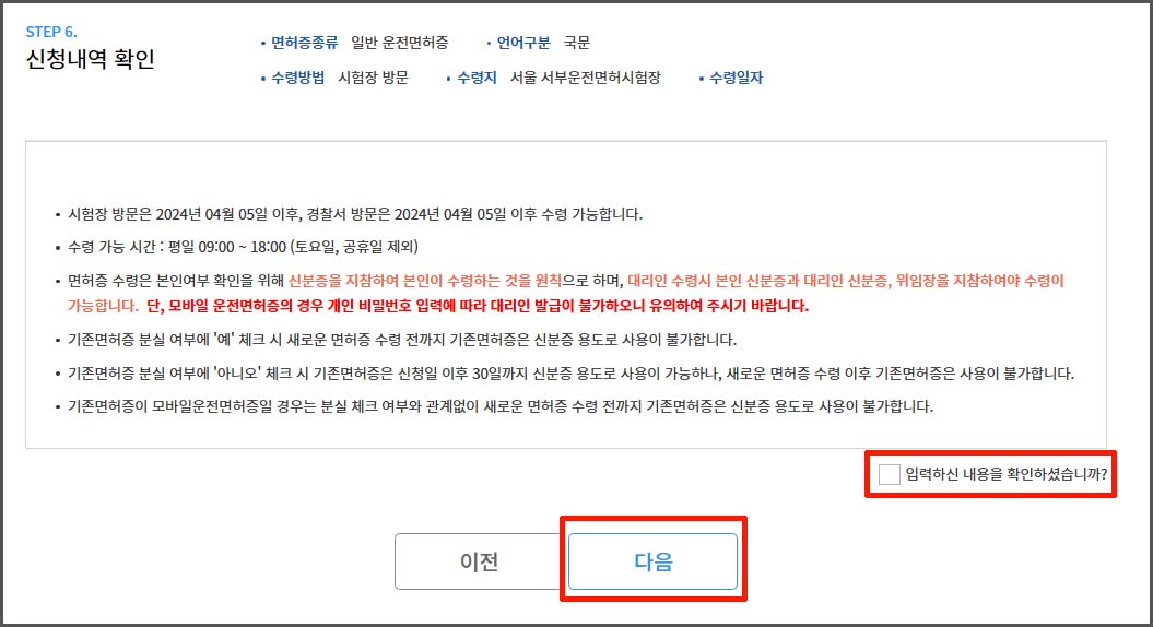 11. 면허증 종류 선택, 언어 구분 선택, 수령 방법 선택, 시험장 또는 경찰서 선택, 날짜 선택 후 신청 내역 확인 후 체크하고 다음 버튼을 클릭합니다.