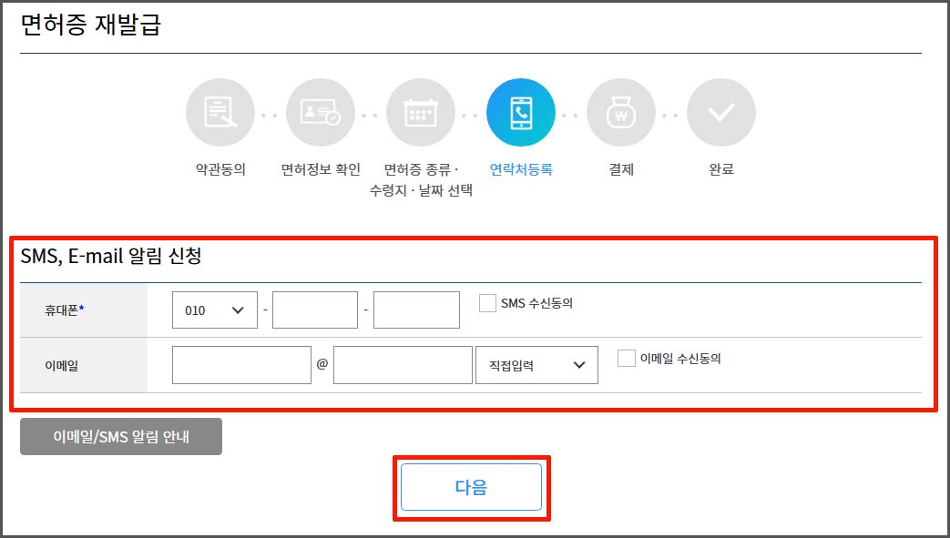12. SMS, E-mail 알림 신청에 휴대폰 번호 (필수 항목), 이메일 주소를 입력 후 다음 버튼을 클릭합니다.