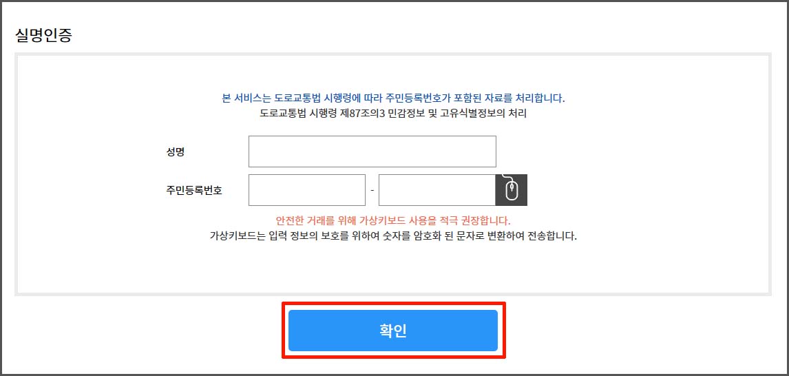5. 실명인증 페이지가 나오면 성명과 주민등록번호를 입력하고 확인 버튼을 클릭합니다.