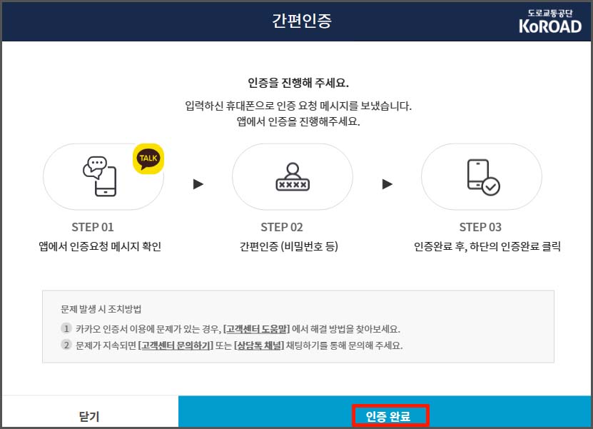 8. 인증 메시지 확인 후 인증 완료 버튼을 클릭합니다.