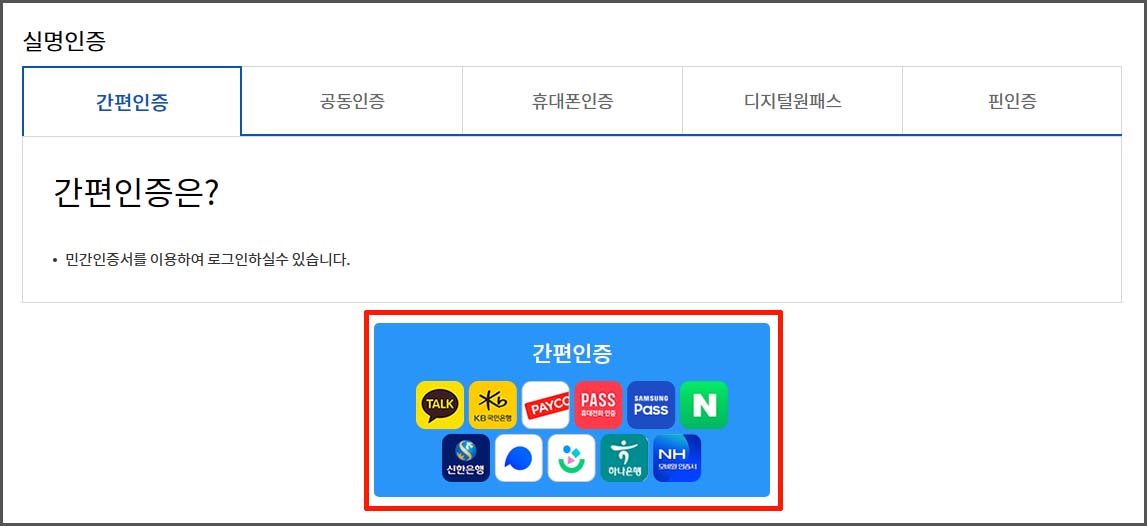 6. 인증할 수 있는 5가지 방법 간편 인증, 공동 인증, 휴대폰 인증, 디지털 원패스, 핀 인증 중 본인에게 가장 편한 방법으로 인증을 진행하면 됩니다. 저는 간편 인증으로 진행하겠습니다.