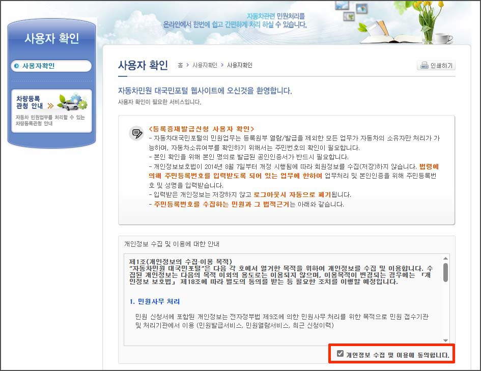 5. 사용자 확인 화면에서 "개인정보 수집 및 이용에 동의합니다"에 체크해 주세요.