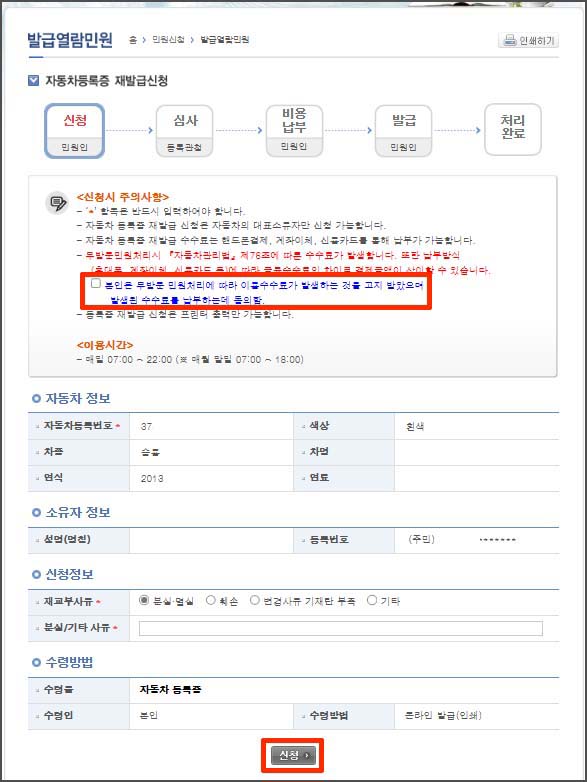 10. 자동차등록증 재발급 신청 화면에서 수수료 납부 동의 항목에 체크, 재교부 사유, 분실/기타 사유 항목 입력 후 하단에 신청 버튼을 클릭합니다.