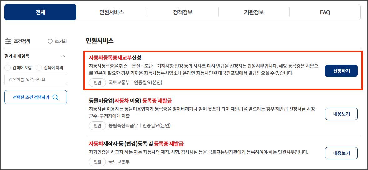 4. 민원 서비스 화면에서 자동차등록증 재교부신청 항목 오른쪽 신청하기 버튼을 클릭합니다.