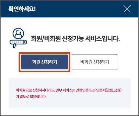 5. 회원/비회원 신청 화면에서 회원 신청하기를 눌러주세요, 비회원으로 신청해도 간편 인증 또는 인증서가 필요합니다.