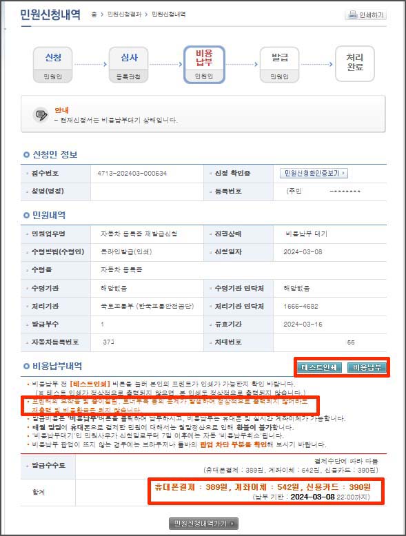 11. 자동차등록증 재발급 신청 내역 화면이 나옵니다. 중간에 보면 테스트 인쇄 버튼과 비용납부 버튼이 있는데요 비용납부 하기 전에 꼭 테스트 인쇄를 먼저 해보는 걸 추천해 드립니다. 프린터 오작동이나 다른 문제로 인해 인쇄가 정상적으로 출력이 되지 않아도 재출력 및 비용환급이 되지 않기 때문입니다.
