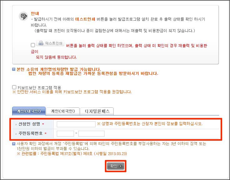 8. 테스트 인쇄 버튼 왼쪽 체크박스에 체크한 후 신청인 성명, 주민등록번호를 입력하고 확인을 눌러줍니다.
