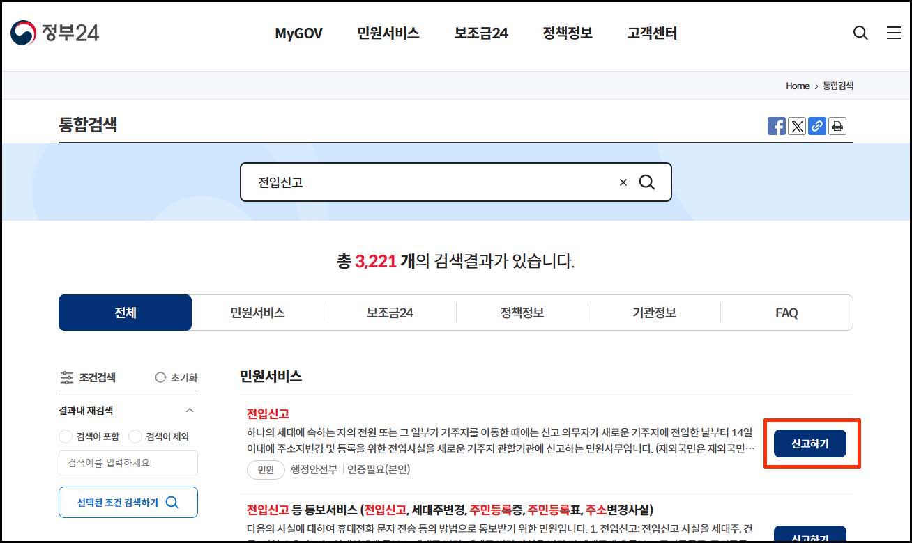 3. 검색 결과에서 민원 서비스 전입신고 항목 우측 신고하기 버튼을 클릭