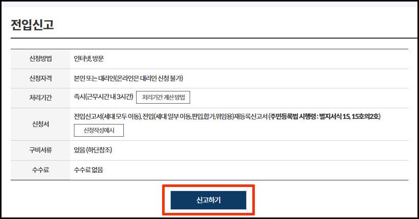 4. 검색 결과에서 전입신고 항목에 있는 신고하기 버튼 클릭