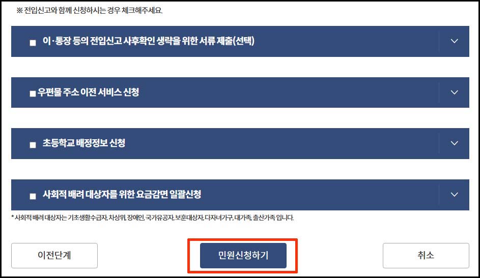 5. 온라인 전입신고 유의 사항 확인 후 신청하기 버튼 클릭