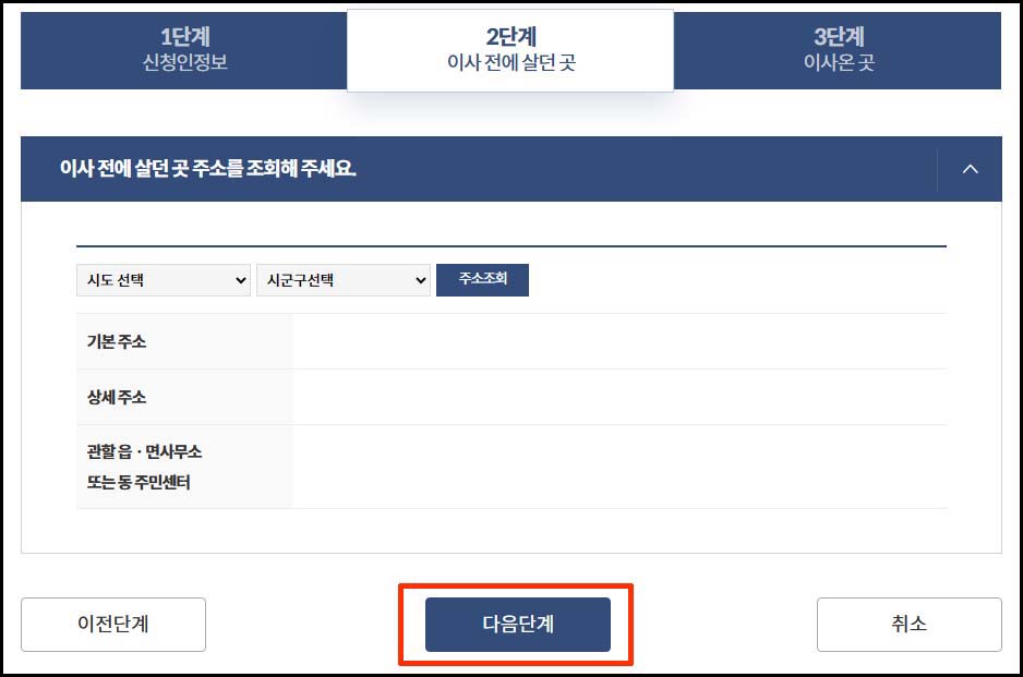 8. 2단계 : 이사 전에 살던 곳 주소 조회 및 이사 가는 사람 선택