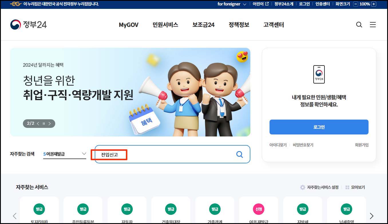 2. 정부 24 홈페이지 검색창에 "전입신고"를 입력하고 검색
