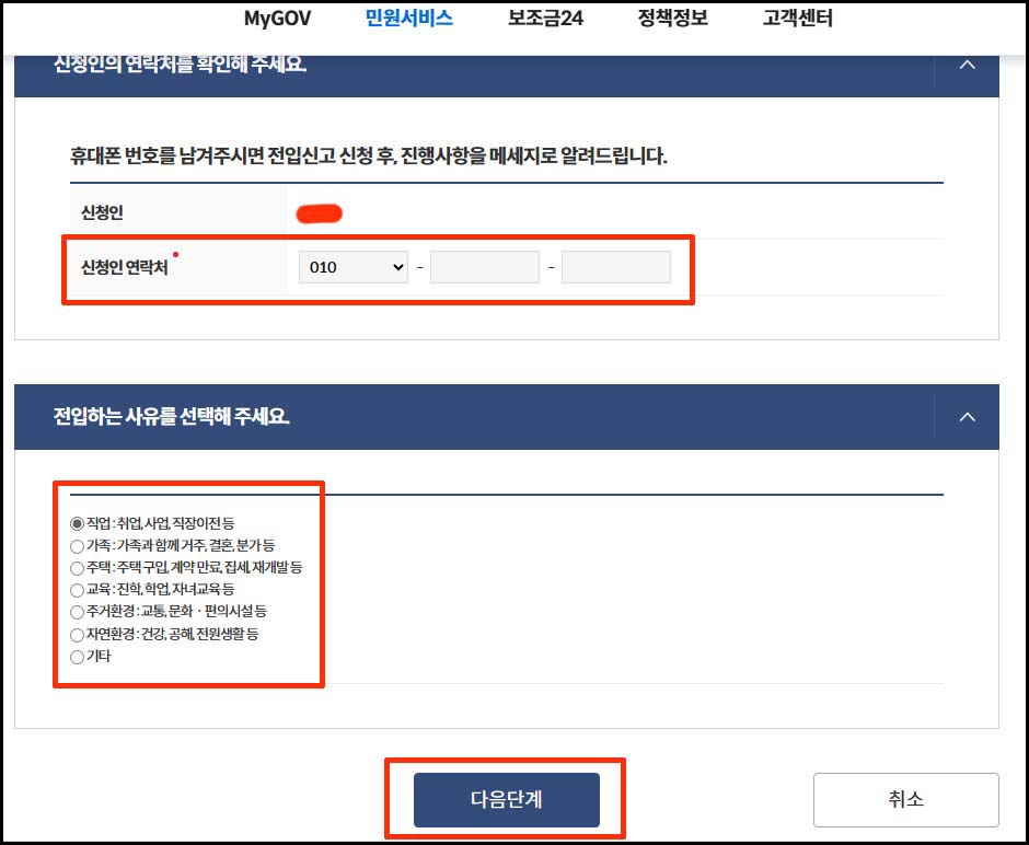 7. 1단계 : 신청인 연락처 및 전입하는 사유 확인