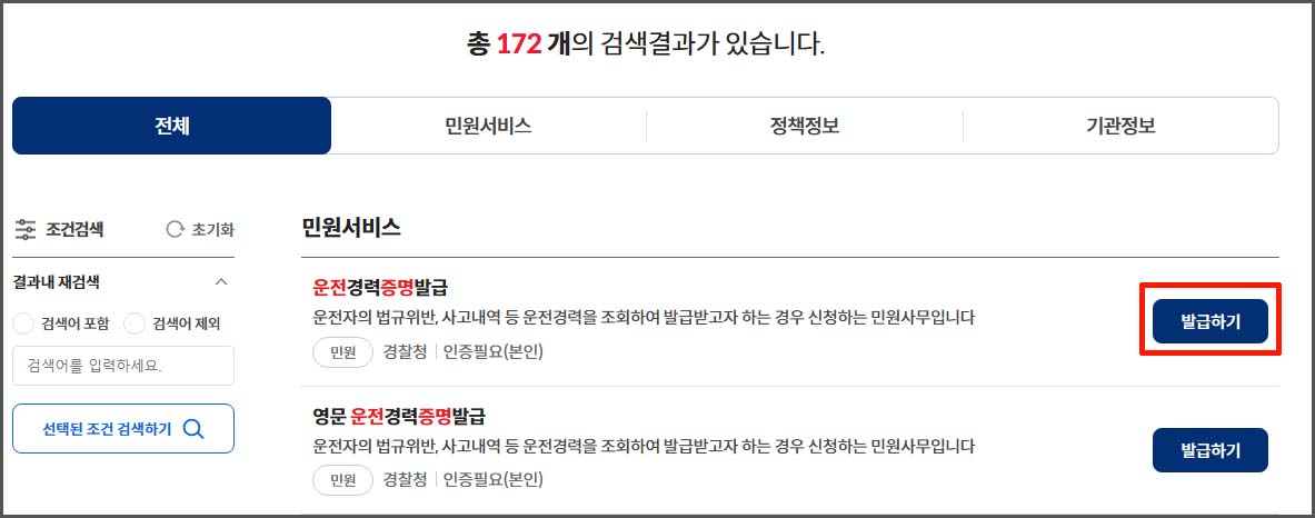 3. 검색된 민원 서비스에서 운전 경력증명발급 오른쪽 발급하기 버튼을 클릭합니다.