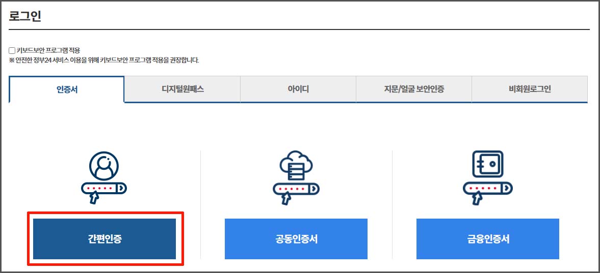 4. 로그인 화면이 나오면 간편 인증, 금융인증서, 공동인증서 중 가장 편한 방법으로 로그인하면 됩니다. 이번에도 간편 인증 카카오톡으로 인증하겠습니다.