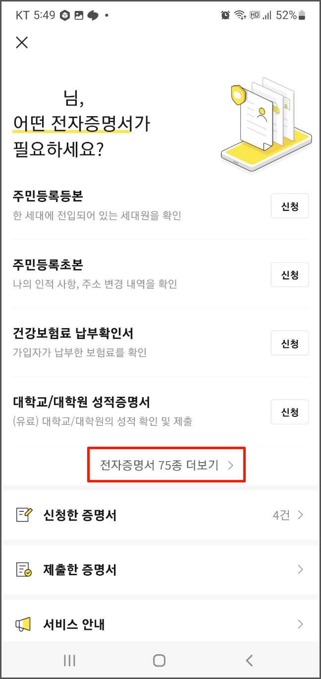 5. 중간쯤 전자증명서 75종 더 보기를 눌러주세요.