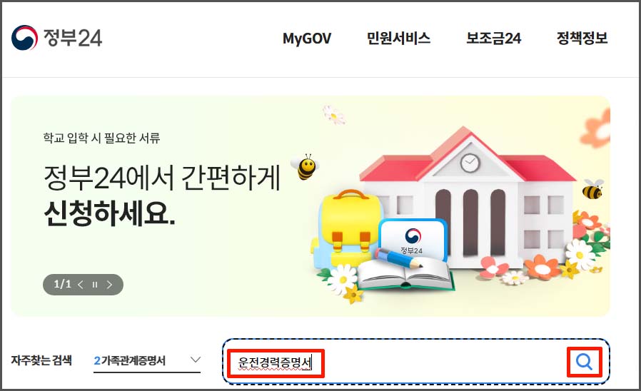 2. 정부 24 홈페이지 검색창에 운전경력증명서 입력 후 검색 버튼을 눌러주세요.