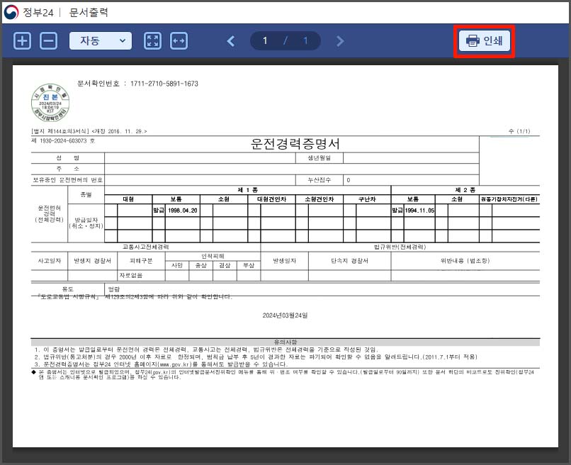 10. 운전경력증명서 미리 보기 페이지 오른쪽 위 인쇄 버튼을 클릭해 주세요.