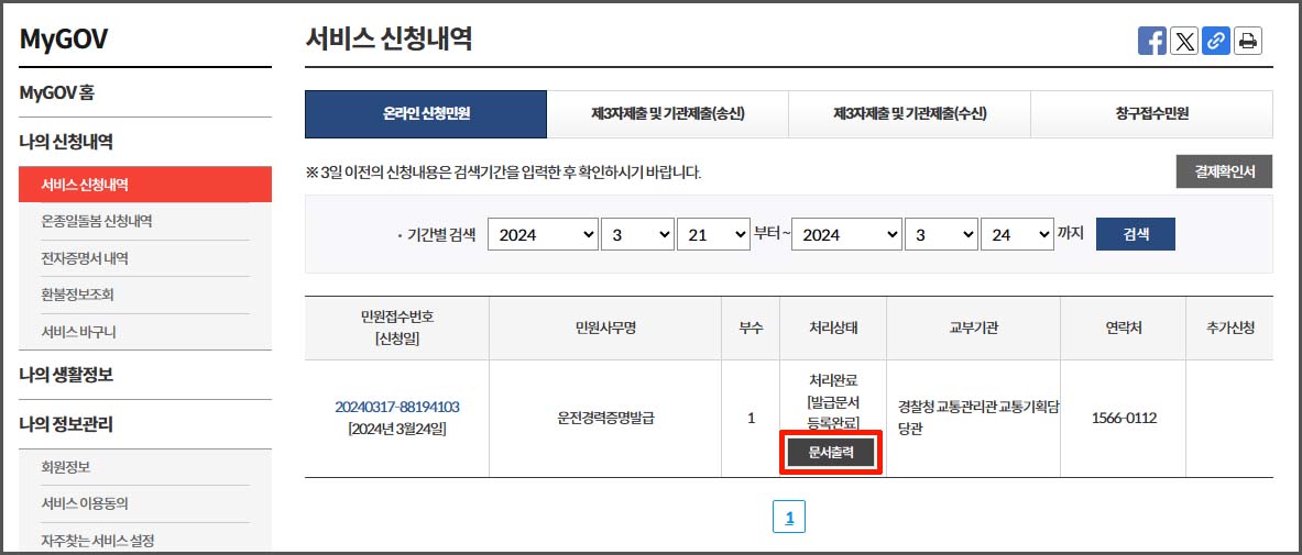 9. 서비스 신청 내역에서 문서출력 버튼을 눌러주세요.